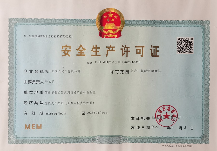 聞天化工安許證書